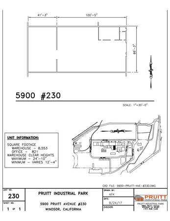 Over 9.300 sf warehouse space available at Pruitt Industrial Park in Windsor, CA with clear heights over 24'.Amenities