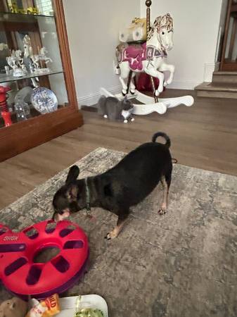 This sweet rescued girl is about a year old. She is healthy, playful, and very affectionate. She has been spayed and is up to date on her vaccinations.