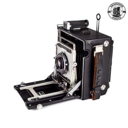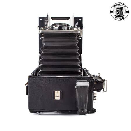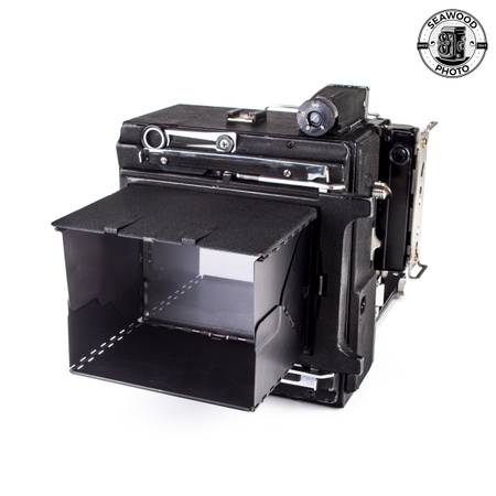 The in-camera rear shutter is working but has not been tested. The coupled rangefinder is working but dim. The ground glass focus is very bright.