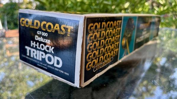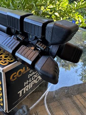 GOLDCOAST GT-300 Deluxe H-Lock Tripod has aluminum channel legs w/center post leg struts that increase its rigidity when fully extended. The tripod has a 3-way pan head w/Quick-Release platform. Its molded carry-grip makes for easy field transport. With 3-section legs fully-extended, including the center post, the camera platform is at 56” H. When fully retracted it is only about 24” L. It comes in its original retail carton, appearing virtually as new. Great for personal use or for gifting. It’s available for local pick-up in San Rafael, cash, Venmo, or PayPal.
