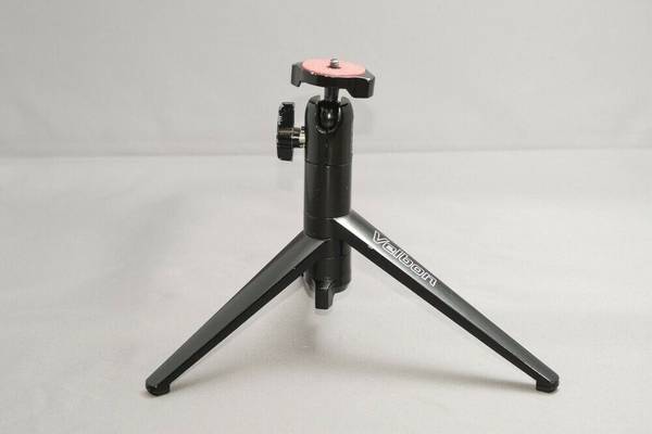 Surplus tabletop VELBON MP-430 Compact Tripod was backup support in case assignment called for low-angle camera platform. While small and diminutive, it's one of the strongest tripods that can be carried in the hip pocket or camera bag. In ‘open’ position it stands about 7” H w/legs extended to about 10” dia. Strength comes solid cast aluminum legs that pivot open to a 3-point stance and lock in place with a wing nut assembly at its base. Ball and socket head can be removed and replaced with a video head, gimbal head, or any other tripod head. It’s made in Japan. It easily holds any DSLR w/most lens combinations. It's an ideal tripod for low level sports work. Easily packs in a camera bag or backpack. It works great at eye-level when set on accommodating terrain, fences, etc. and can be used as a regular tripod by placing on walls fences, trees, etc. It’s available for local pick-up in San Rafael, with cash, Venmo, or PayPal.