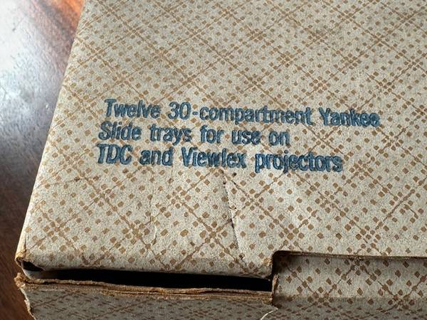 Case of Twelve vintage ‘Universal 30’ Slide Trays by YANKEE, c. 1960s come in the original bulk corrugated carton/carrying case. The Yankee tray slide slots are numbered 1 – 30 for identifying/organizing purposes. Made in the USA, the 30-capacity trays fit slide projectors from several manufacturers, including KODAK, ARGUS, . Each tray is about 2-5/8” x 7” L. Case price only, no individual tray sales, available for local pick-up in San Rafael, cash, Venmo, or PayPal.