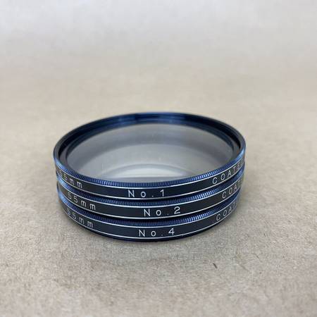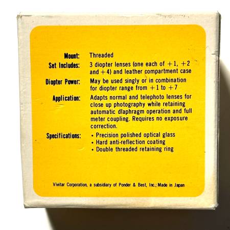 Brand-new old stock VIVITAR Close-Up Lens Set is intended for prime lens w/55mm filter diameter. Set includes +1, +2, and +4 diopter filters that enable macro photography using a standard lens. They can be used singly or in combination for diopter range from +1 to +7. These filters are precision-polished optical glass. w/hard anti-reflection coatings. Each filter has a double-threaded retaining ring. The set includes a small leatherette compartment case w/snap closure. It is available for local pick-up in San Rafael, cash, Venmo, or PayPal.