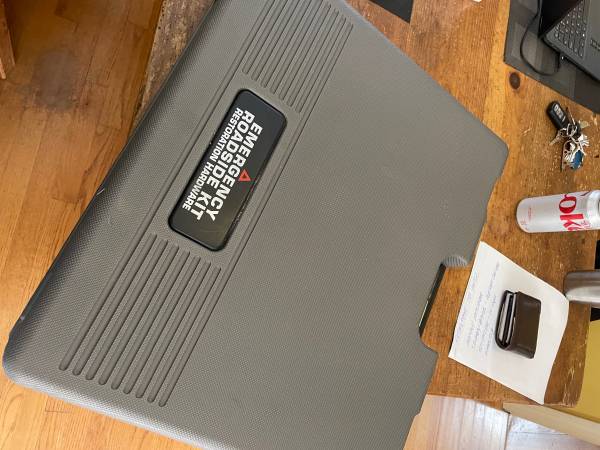 Brand new! - Mini Air Compressor (plugs into cig lighter), Flashlight/Emergency Beacon, Lug nut wrench w/ 4 diff size sockets, Triangle reflector, Medical Kit, Channe-lock tool, Digital tire pressure gauge - Kit is just missing Jumper Cables that are easily replaceable