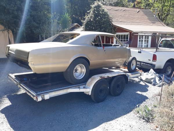 1966 Oldsmobile Cutlass F 85 with the title old race car in Bakersfield had a 455 engine selling without engine and tranny everything is new new interior new chrome bumpers extra parts dashboards 442 tilting steering wheel new painted many years ago been in the garage for close 20 years ready to get put back together trade for Ford engines or $12,000