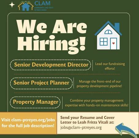 This position offers meaningful impact while working in the stunning coastal landscape of West Marin. Split your time between office, remote work, and site visits throughout breathtaking natural settings—from Pacific coastline to pastoral valleys and charming towns. Work under CLAM's supervision while also serving the entire West Marin Housing Collaborative (Stinson Beach, Bolinas, Point Reyes, Inverness, and San Geronimo Valley), making a tangible difference in communities where housing solutions are critically needed. Your work will help preserve socioeconomic diversity by creating housing opportunities for essential workers and longtime residents.