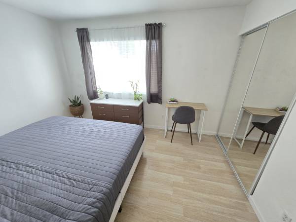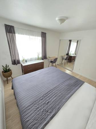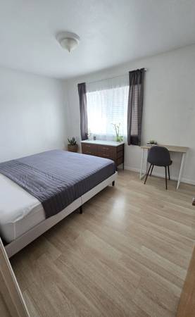 The room is currently furnished with a king bed, a six-drawer dresser and a small desk. Furnishings can come with or without the room rental, let me know which you prefer. Hardwood flooring, floor heater, glass closet doors, lock and key and plenty of natural light. My plants love this room. WiFi included, no gaming.
