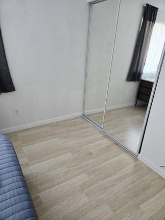 The room is currently furnished with a king bed, a six-drawer dresser and a small desk. Furnishings can come with or without the room rental, let me know which you prefer. Hardwood flooring, floor heater, glass closet doors, lock and key and plenty of natural light. My plants love this room.