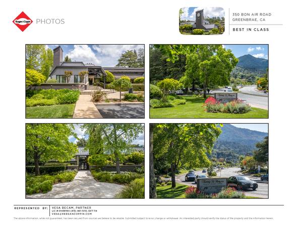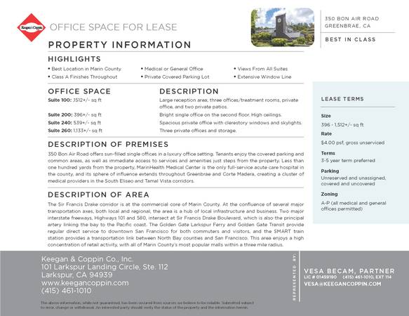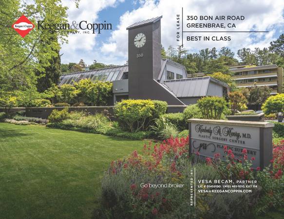 350 Bon Air Road offers sun-filled single offices in a luxury office setting. Tenants enjoy the covered parking and common areas, as well as immediate access to services and amenities just steps from the property. Less than one hundred yards from the property, MarinHealth Medical Center is the only full-service acute care hospital in the county, and its sphere of influence extends throughout Greenbrae and Corte Madera, creating a cluster of medical providers in the South Eliseo and Tamal Vista corridors.