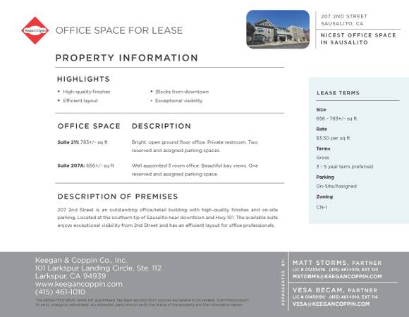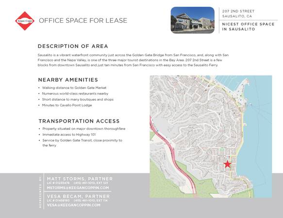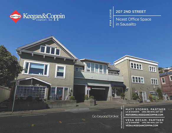 207 2nd Street is an outstanding office/retail building with high-quality finishes and onsite parking. Located at the southern tip of Sausalito near downtown and Hwy 101. The available suite enjoys exceptional visibility from 2nd Street and has an efficient layout for office professionals.