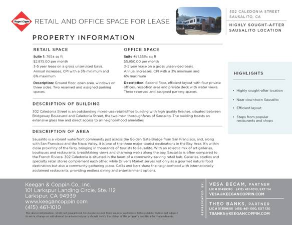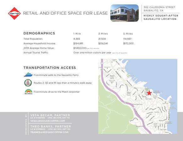 302 Caledonia Street is an outstanding mixed-use retail/office building with high quality finishes, situated between Bridgeway Boulevard and Caledonia Street, the two main thoroughfares of Sausalito. The building boasts an extensive glass line and direct access to all neighborhood amenities.