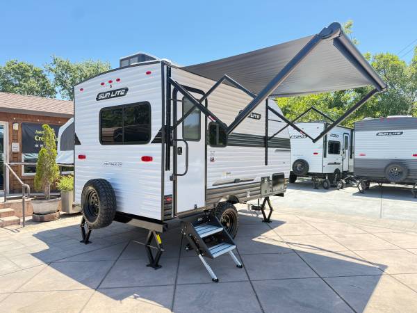 All New 2026 Sun-Lite 15MBX Sport Ultra-Lite Off-Road Hybrid Camper that Sleeps up to 5 people! Only 15 Feet and Length and a Dry Weight of ONLY 2,500 Lbs, This All-Inclusive Camper comes equipped with: A Large Wet Bath (Shower and Toilet), 12 Volt Refrigerator/Freezer, 200 Watts of Solar, Rooftop AC Unit, Propane Gas Furnace, 2 Burner Stover, Holding Tanks (Gray and Black, Fresh Water Tank, 12 Volt Water pump, TV Hook Ups (Both 110V and 12V) a 6 Gal Gas Water Heater, LED Lights, Exterior Shower, 2 Large Beds, a Sofa that Converts into another Sleeping Space, Bar Countertop with Bar Stools, Microwave, Bluetooth Stereo, Electric Awning with LED Lights, Lots of Windows with Shades, Plenty of Cabinetry with Storage, Fold Down Steps and So Much More!