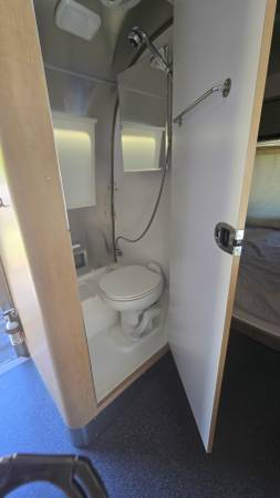 The interior offers a full-size bed and plenty of closet space. There is ample storage throughout the cabin and in the undercarriage compartments.
