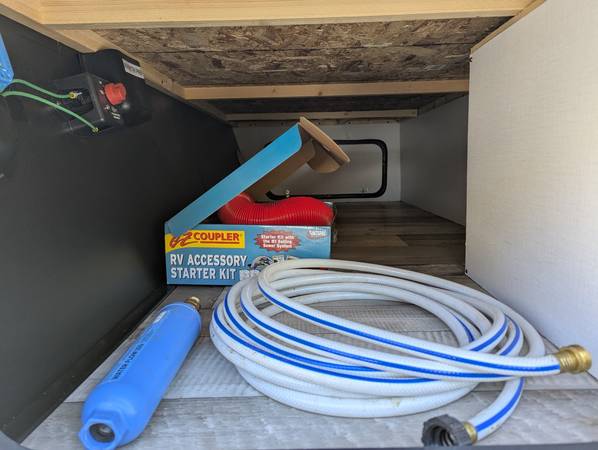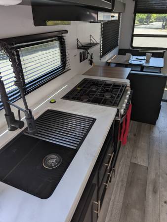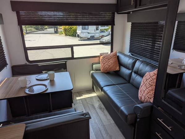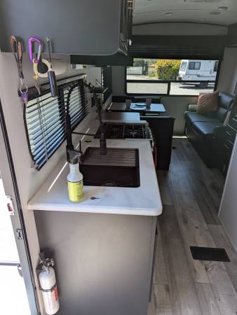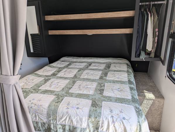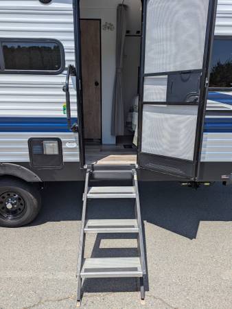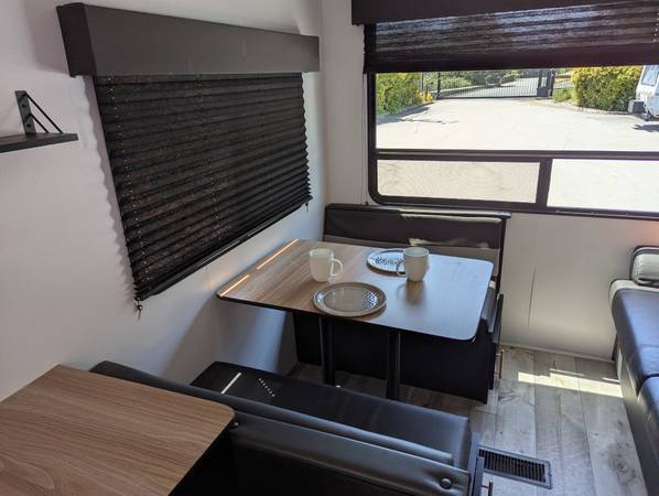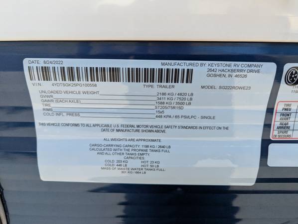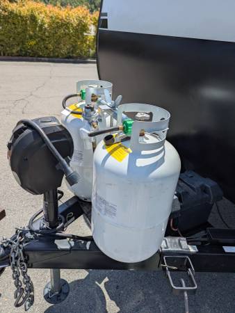 The bathroom has never had the shower or toilet used and are like new. The interior is like new and exterior is also. This trailer needs nothing and is ready to roll. I'll even include the brand new equalizer hitch assy. It has electric tongue jack and electric awning and stabilizing jacks. Deluxe steps and led lights in the awning and through out the trailer. The kitchen is very nice with plenty of counter space and a big fridge, and lots of cabinets. Dinette booth and fold down couch, and Queen size bed with a comfortable mattress. No slide out means no problems and the interior still has plenty of space, perfect for a couple. Has Roof top solar panels a lithium battery 60 gallons of water capacity, grey and black 40 gal. dry weight 4770lbs 2750 payload 7520 GVWR easy to tow with a SUV Current book value around $22-24k