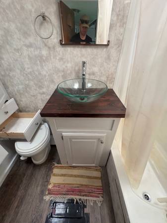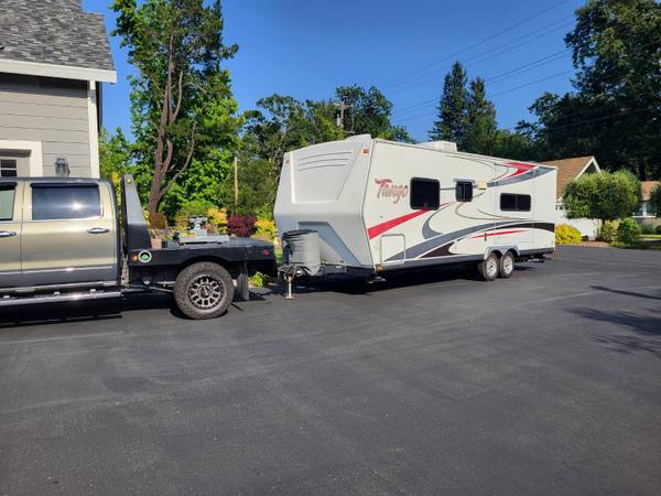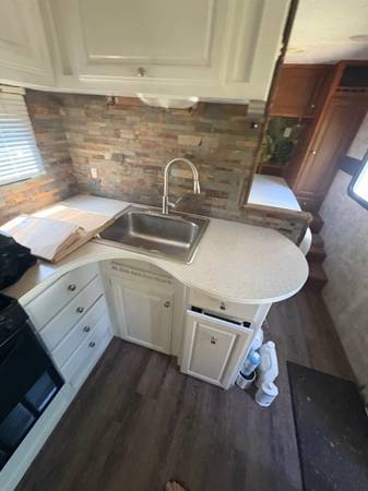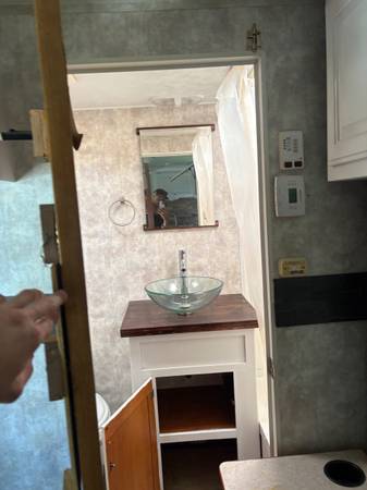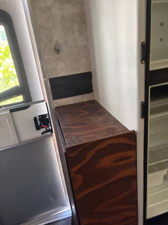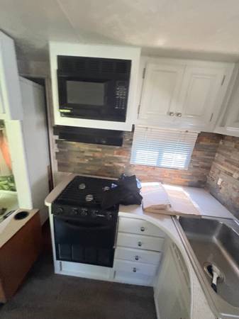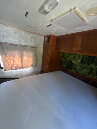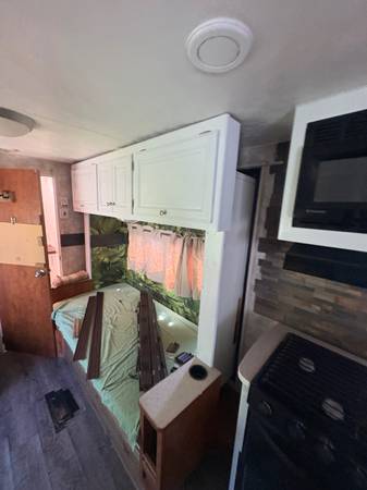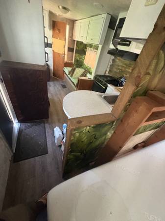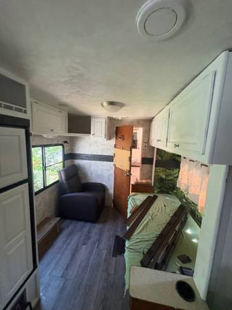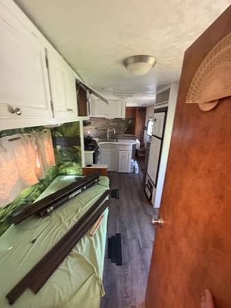28 feet long. One slide out. Completely refinished inside. Purchased in 2017 and only towed approximately 40miles since then.