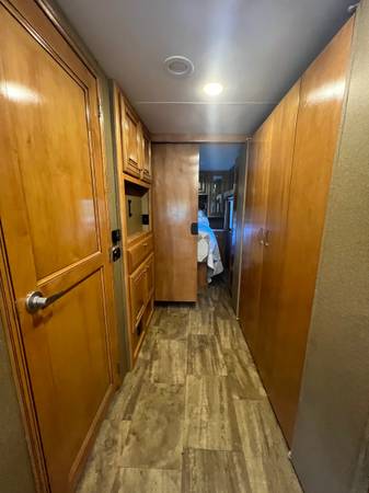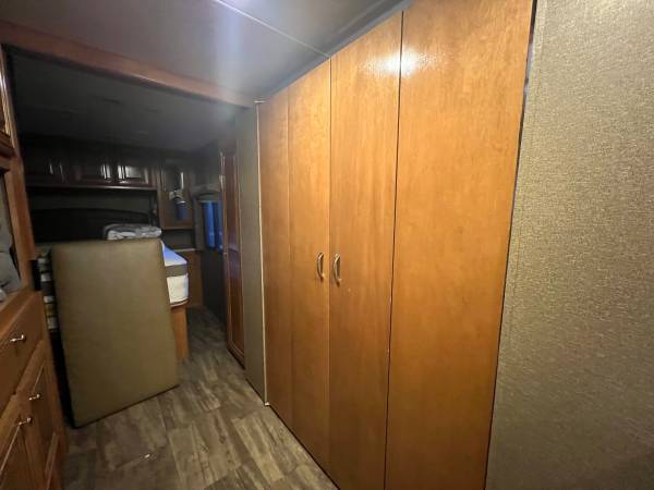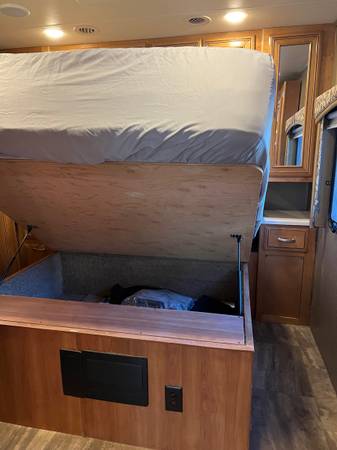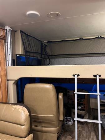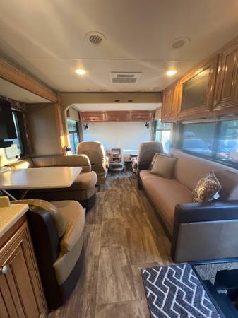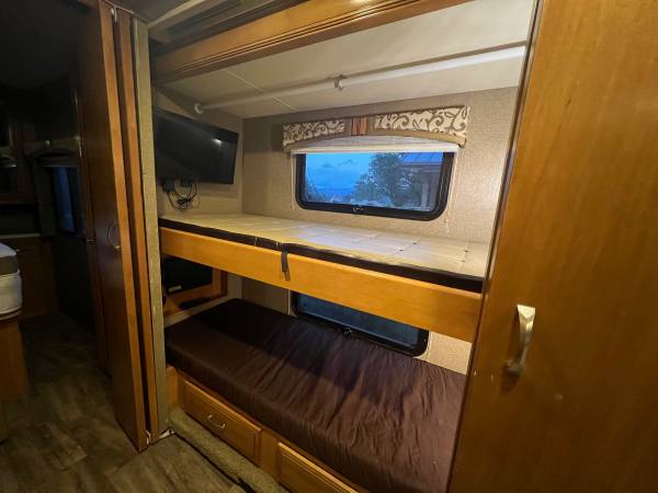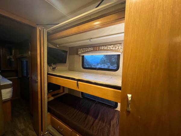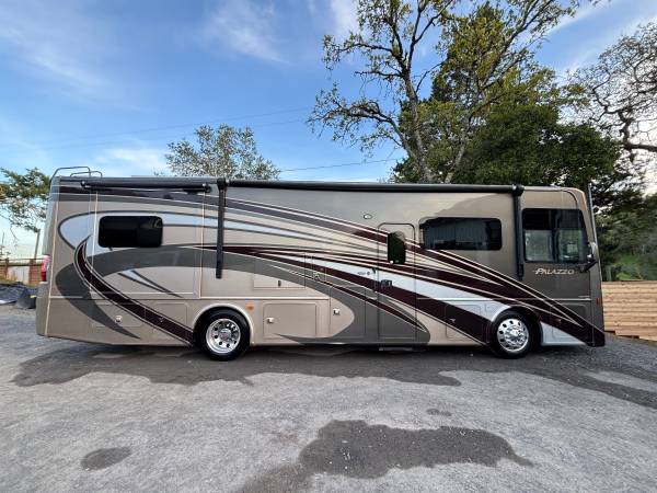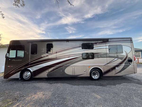 2016 Thor Palazzo Bunkhouse 33.3 RV with two Slide-Outs Class A Diesel Motorhome. This Coach is built on a Freightliner Chassis and powered by a Cummins ISB 6.7L 300XCS Diesel Engine with only 38,000 Miles! Equipment includes: Aluminum Aftermarket Wheels, Side-Hinged Baggage Doors, Pass Through with Slide Storage Tray, Automatic Hydraulic Leveling Jacks, 2,000 Watt Inverter, 3M Film Front Mask, Solar Panel, Exterior Entertainment Center w/TV, Motorized Awning, Front and Rear Ducted Roof A/Cs, Exhaust Brake, 3-Camera Rear Vision System, Power Driver Seat, Power Sun visors, Dropdown Overhead Queen Bunk, Water Filter, DVD Players, LCD TV in Bedroom, LCD TV in Living Area, TV/DVD Players in both Bunks, Residential Refrigerator, Convection Microwave, Solid Surface Countertops. Equipped with an Onan 6.0KW Diesel Generator with low hours. Full body paint. The Floorplan features: Dual Slide-Out, Jackknife Sofa, Dinette that converts to sleeping bed, Queen Bed, Rear Wardrobe and twin bunkbeds. Sleeps up to 10. IRV tow system and tire pressure monitors included. Lithium-Ion batteries in the Coach. Generator Exhaust Tower. 2022 Tires with very low miles. Needs new upholstery on the sofa, dinette and front seats. New seat covers in all areas.