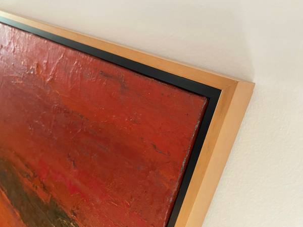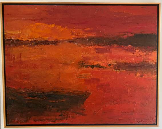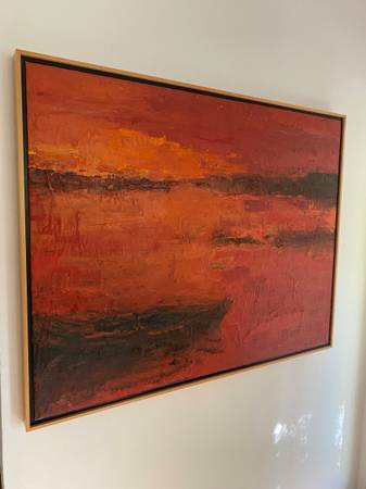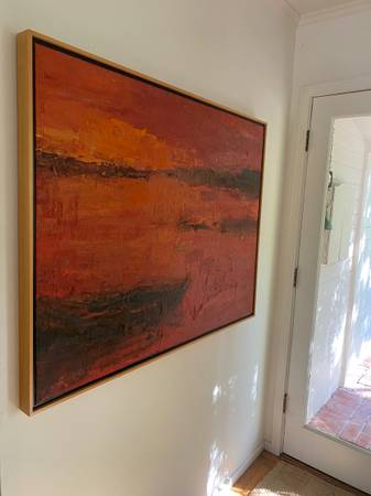 Dramatic evocative artwork inherited recently and will not have space. Solid maple and ebony frame. Nearly four feet across. Oil on canvas. In excellent condition. Signed on front lower right.