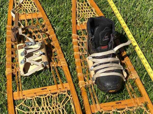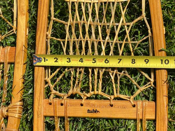 Vintage 1960s rawhide-laced wood snowshoes, handmade in Vermont by Tubbs. 56 x 10 inch, Alaska style. Fully functional and usable for snow travel, of great for "rustic cabin decor." Well maintained with coats of spar varnish over the years. (Note: owner's name engraved in wooden cross bar.)