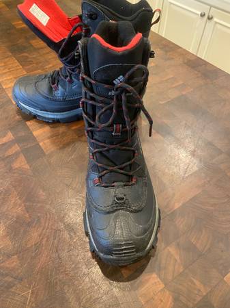 Columbia Bugaboot III insulated waterproof boots in like new condition. These were worn a couple times after skiing last winter by my son, who has outgrown them. With a little wet wiping, these could easily pass for brand new. They cost about $100 new. Here’s Columbias description: