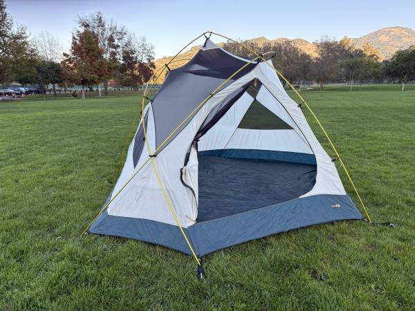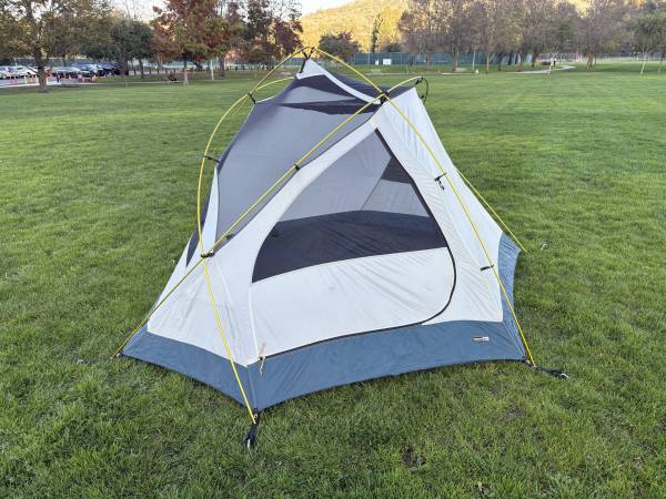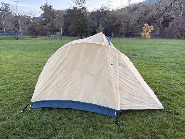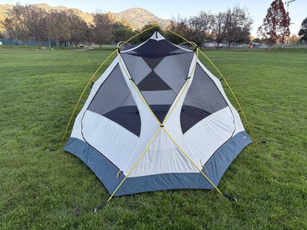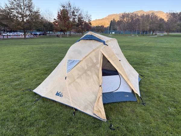 The Taj 3 backpacking tent from REI is a lightweight, 3-season tent, that sleeps up to three people. Complete with rain fly and ground cover it's suitable for bad weather, but large screen protected windows make it a pleasant hangout in summertime as well. When set up its dimensions are 96"l x 94"w x 52"h. It weighs 8.8 lbs and fits into a 25" x 7" diameter bag.