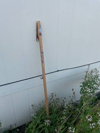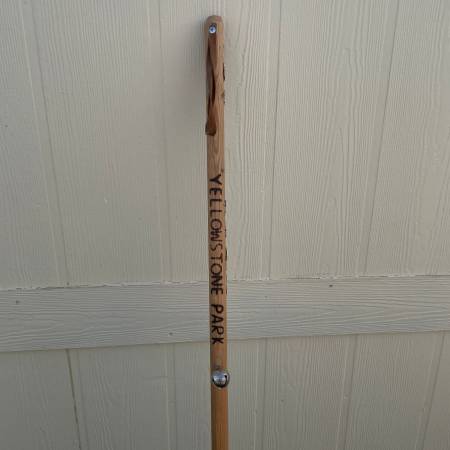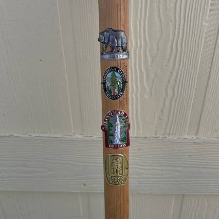 Super cool trekking pole with medallions from many national parks! Redwoods, Mt. Lassen, Yosemite, Yellowstone, Crater Lake, etc. The tip is slightly sharp with a red color on it. Obviously well-loved memento of many fun trips!