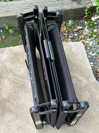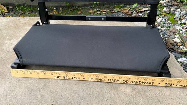 Pair of Black StadiumChair Deluxe Wide Lightweight Folding Bleacher Seats have the removable stitched back screen-printed w/Redwood High School logo. These seats have bungee cord cushioning, Cordova canvas upholstery, and a square tubular steel frame that ensure comfort and durability for generations. They can attach to almost any metal or wooden bleacher using bottom-mounted pivoting hook and the rubber nonslip skids help keep the chair in place. The back bar has a rubber handgrip that makes for a comfortable toting. These seats are extra wide by 4” over the standard-width bleacher seats. They open to about 21” W x 13-1/2” D x 16” H; folded they are 13-1/2” x 21” x 4”. A new StadiumChair without the custom school logo retails between $60-$70 each, with logo, $80-$90. A bargain here for the pair, available for local pick-up in San Rafael, cash, Venmo, or PayPal.