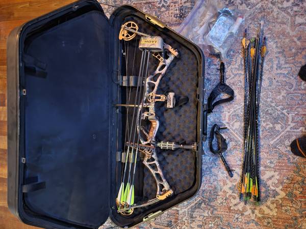 Hoyt Trykon XL 75th anniversary special edition compound bow for sale. Plenty of extras, two wrist releases, broadheads, case, ect. Also included is a foam target that I don't have pictured. Make me...