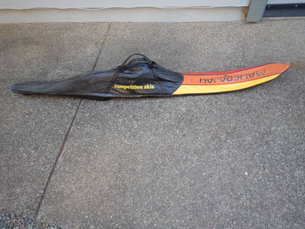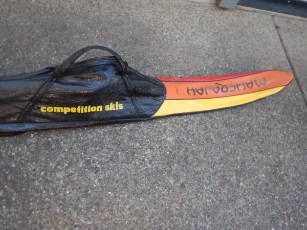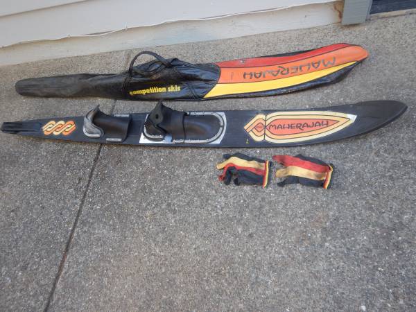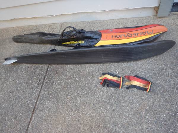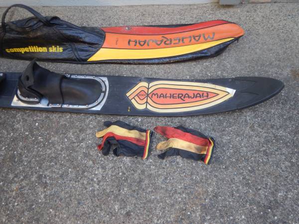 Vintage 1980's Maherajah Competition "2001" black graphite Maha waterski. 175cm with case. Slalom ski, with the concave bottom. Small scuff on the original carrying case. What's really cool is that it includes the original Maherajah waterski gloves, in the same Maha colors. I've never found the gloves before........This ski came from a Healdsburg CA estate. Bob Maher used to make waterskiis up up in Healdsburg. $175