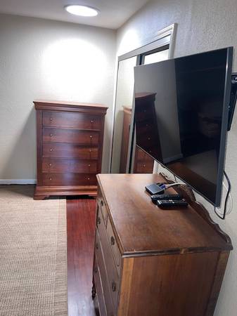 The Bedroom is Furnished with Bed, and a few Dressers a NEW 43" SAMSUNG SMART TV and nd Tables, etc.