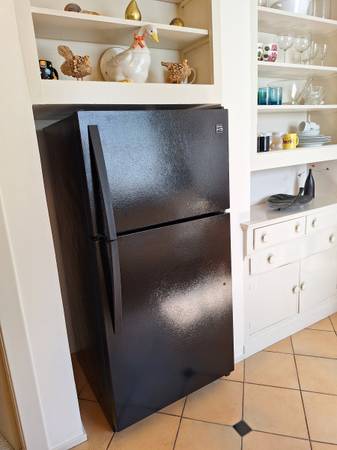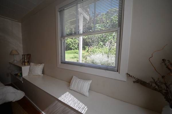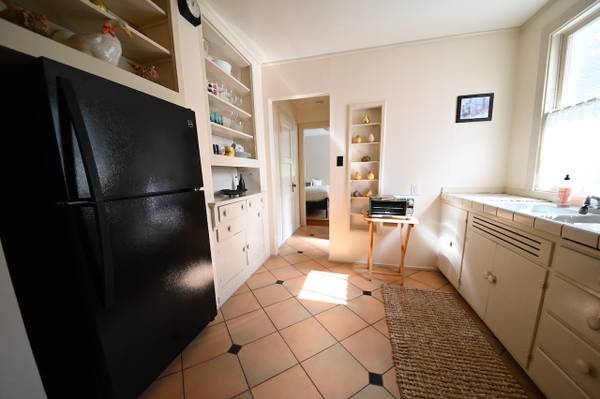Eat in kitchen with Italian tile floors. Bedroom looks onto quiet rear garden with flowers and lawn.