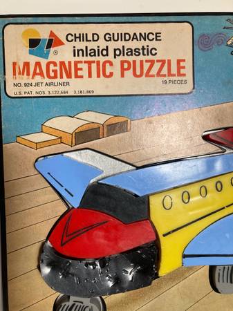 Theee puzzles from A child guidance toy Vintage Disney A Child Guidance Toy Donald Duck Puzzle 1964 No. 951 Puffy the tugboat #904 Jet Airliner #924 One small yellow piece missing and one black...