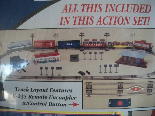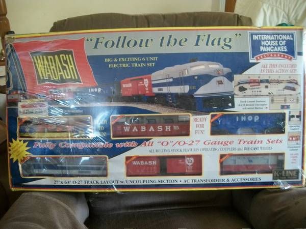 NIB 1995 K-Line "Follow the Flag" electric train set. 6 unit Wabash, International Pancakes model # 1501A. Never been opened, only some tearing of the plastic wrapping around box. 27" X 63" 0-27...