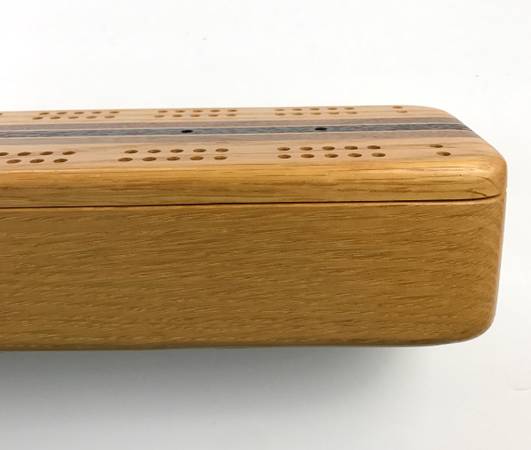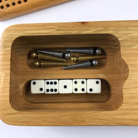 A handmade mixed hardwood cribbage board game box with a complete set of dominoes inside.
