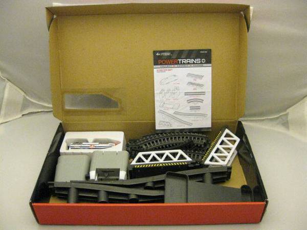 Power Trains Starter Set - opened for one-time use then stowed away. Complete train setup out-of-the-box includes: 1 motorized Engine, 12' of Figure-8 Track, 1 Draw Bridge, Signs, and instruction pamphlet. [NOTE: Starter set has only the Train Engine; cars are available elsewhere on-line for additional cost.] Engine requires 2 - AAA batteries, included. Carton is sturdy, reusable to stow the set. Set is intended for Ages 4+, with adult supervision; for independent child play, Ages 6+. It’s available for local pick-up in San Rafael, with cash, Venmo, or PayPal.
