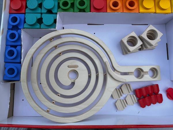Hape/Quadrilla ‘Whirlpool’ Wooden Marble Run is used but well-kept. The 106-piece set is complete, including blocks, tracks, 50-piece marble set w/cloth bag, and detailed instruction book. Its original retail clamshell carton is fully intact w/internal block storage cubbies, and its plastic handle. It’s fully intact with only minor shelf wear. The ‘Whirlpool’ building components include various colored wooden building blocks, distributor blocks, height adjusters, stabilizer rings, curved and S-curved rails, and a spiral funnel (whirlpool.) The set is intended for Ages 4-yrs and up. It’s available for local pick-up in San Rafael, cash, Venmo, or PayPal.