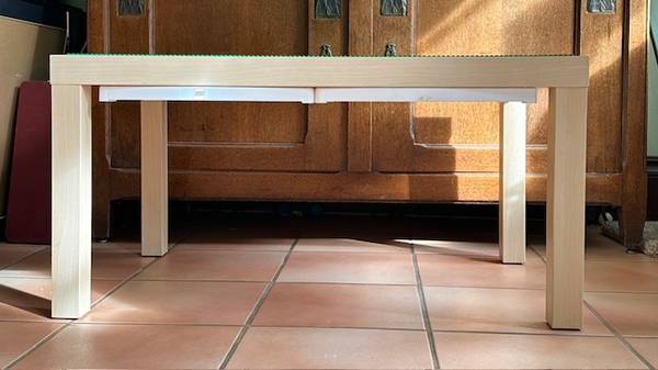 LEGO Building Table w/Fixed Green Baseplate Array is used but well-kept; my grandson just has outgrown it. The table is about 35” W x 21-1/2” D x 17-1/2” H. It is relatively lightweight, made of light-density fiberboard core with a light wood veneer (possibly ash.) The tabletop has a set of fixed green LEGO baseplates (embossed w/LEGO logo,) abutting each other tightly to form a uniform, uninterrupted LEGO baseplate 33” W x 20 “ D. (The table did have a pair of plastic bin drawers mounted on its underside; those were lost during a move and only the white attachment plates remain.) The table legs are about 2”-sq., screw-mounted, easily removed. Each has a felt pad to protect flooring and easy movement across the floor. Similar tables on-line retail well over $100, a bargain here and available for local pick-up in San Rafael, cash, Venmo, or PayPal.