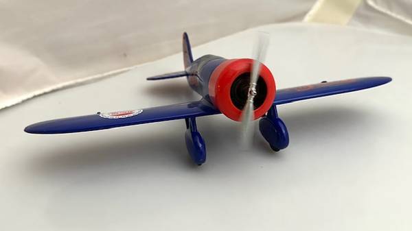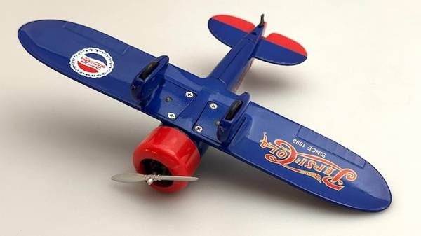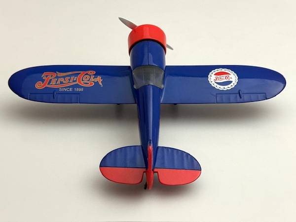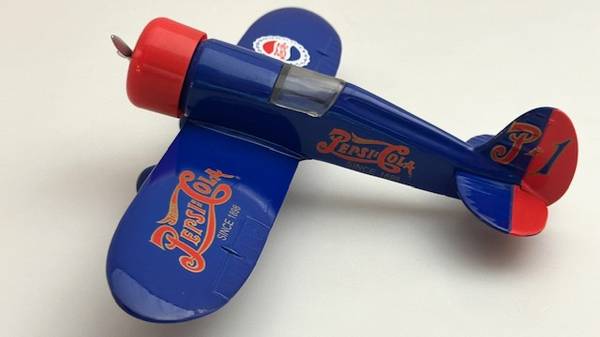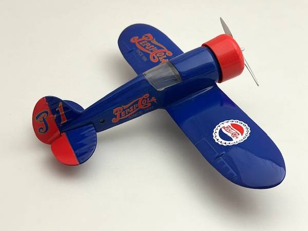 The ‘Pepsi-Cola #1’ Die-cast Airplane Bank, ‘The Travel Air Mystery Ship’ is 1:32-scaled. It was originally marketed in 1993. As a great toy airplane, it has a spinnable propeller, the wheels in the fairings roll, and the plastic cockpit canopy is removable. And it’s a coin bank: lift the pilot canopy off to insert coins; rotate nose cowling clockwise and pull-off to remove coins. It is about 7-1/2” L w/wingspan of 10-1/2”. It’s made by the hobby model maker Revell-Monogram. It appears virtually new but without original retail packaging. It’s available for local pick-up in San Rafael, cash, Venmo, or PayPal.