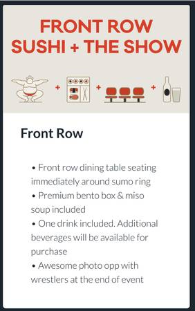 - Each ticket includes: front row seating around sumo ring + Premium bento box included + One drink included + Awesome photo opp with wrestlers at the end of event
