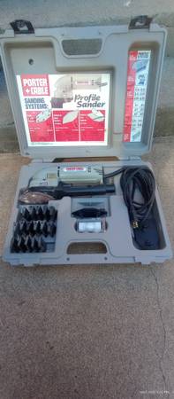 Old school Porter-Cable detail sander, many different profile attachments with offset for the really awkward areas, has dust collection attachment and comes with case. $20