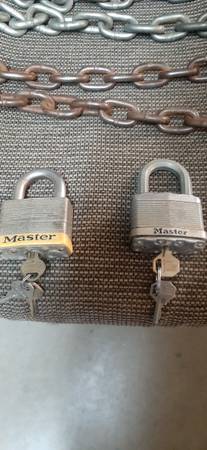 MASTER Heavy Duty Locks and Chains with Keys. 2 Big MASTER Locks with 2 Sets of Keys. 2 Copies of Keys to each Lock. 2 Sets of Heavy Duty Chains. One of the Chains is almost 4ft.(46 inches) & the other Chain is just longer then 3 FT (38 inches). In Perfect Working Order. There all Ready to Lock up your Gates or Garages. 2 sets of Locks and Chains. Prolly over 100$ if you went and bought from Harware Store