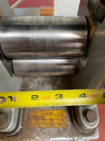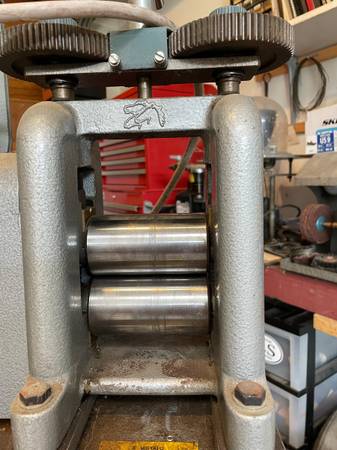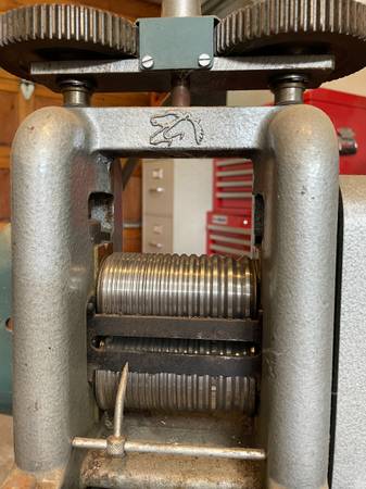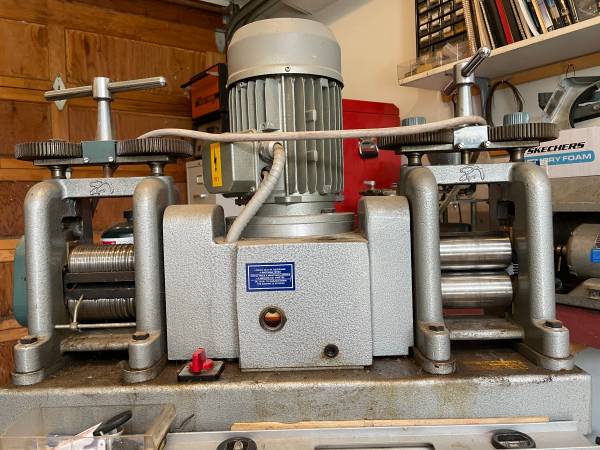 Filli Cavallin 120mm combination automatic rolling mill One side wire rollers; the other side sheet rollers Table top model Technobi srl motor 110 V, 60 Hz, 1.2 hp, 1080 rpm, 15.6 amps; roller width...