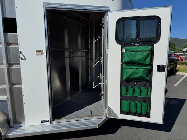 The 2025 Maverick Horse trailer is a roomy two horse model with large 43" wide stalls and 7' 6" of interior headroom. Stall area has heavy duty floor mats, light and a padded jailbar style divider. With a large carpeted tack room you will have plenty of space for your gear as well, included in the tack room is: Bridle hooks, blanket bars, spare tire, brush bag, light and a very nice swing out saddle rack.