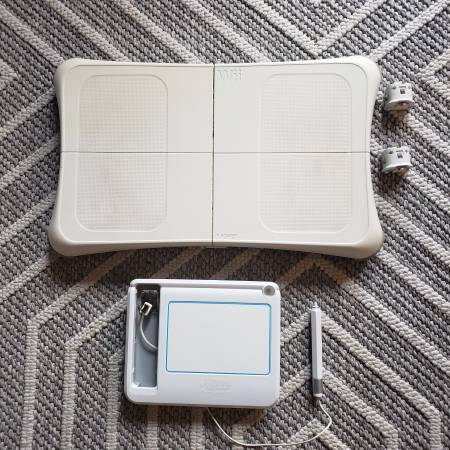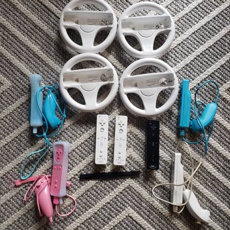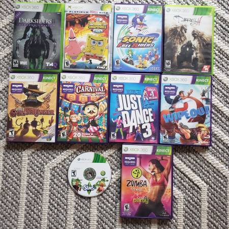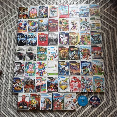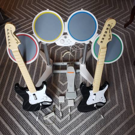 55 Wii games, including Mario Kart, Super Mario Galaxy, Super Smash Bros. Brawl, Legend of Zelda: Twilight Princess, Rock Band (including regular Rockband, Rock Band Track Rack, and Beatles Rockband) and Wii Sports with many family games - plus 9 Xbox games, including Sonic Free Riders and Spongebob The Movie. Working Wii and Xbox consoles with all required hook-up cables - no portable Hard Drive in Xbox. Full Rock Band accessories - 2 guitar & one drum Set controllers with Guitar Dongles and Goodman 4 port USB Hub. Also, Wii Fit Balance Board, U Draw contoller, 7 Wii Hand-held controllers, 4 Nunchuks, and 2 Motion Plus Adapters, Xbox Kinect Sensor Bar(many Xbox games are for Kinect) and (an only used once) Atari Retro Video Game System (complete).
