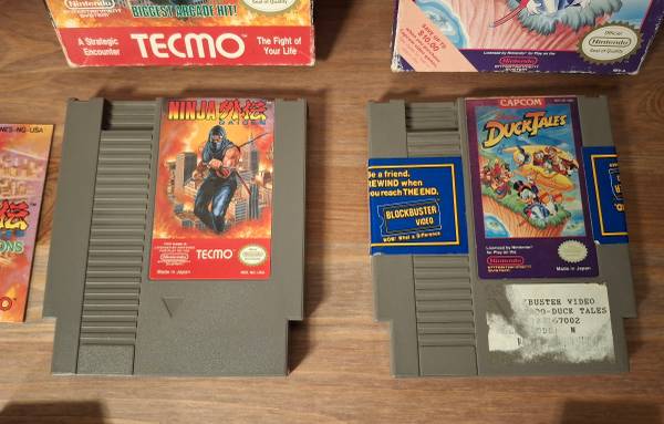 - Duck Tales: Box and Cartridge only. Box is in ok condition. The Cartridge has seen better days as it is covered in a Blockbuster tape and bad labels.