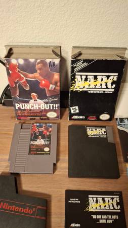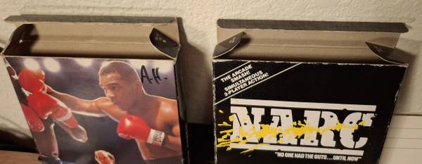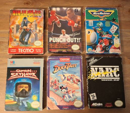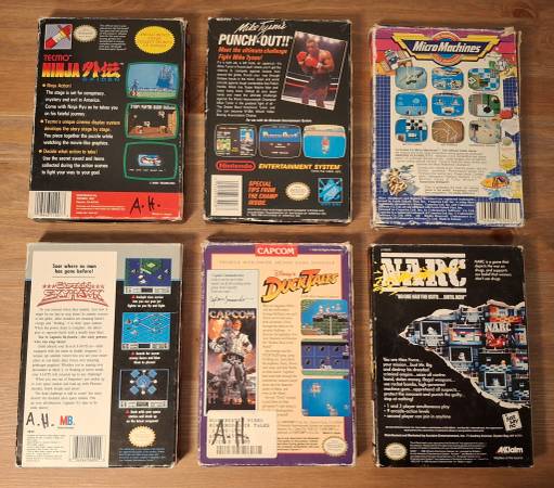 I have a lot of 6 Boxed NES games in varying degrees of condition and completeness. For sale together, am not selling these separately. I was second owner for every game except NARC which I am the original owner, and every game works. Every game, except Narc, has the initials AH somewhere on its box.