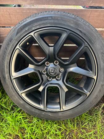 Full set of 2022 Ram 1500 Laramie Night Edition black 22” wheels and tires. Approximately 12-13k miles on them if my math is correct. Still very useable. Tires are mounted and balanced. Tires are Eagle Touring 285/45/r22.