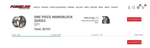 Manufacturer description "The Forgeline CF1 is a fully-forged one-piece monoblock wheel. Utilizing manufacturing technology similar to our very successful GA1R wheel, the concave 5-spoke design of the CF1 looks great and allows plenty of room for caliper clearance and extreme brake fitment. The one-piece monoblock forging and computer-simulated FEA design process yield a wheel that is ruggedly handsome, extremely stiff, and has excellent fatigue strength."