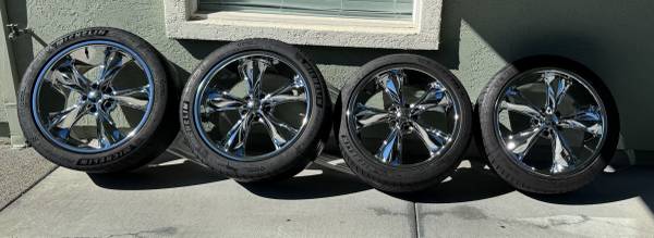Foose legends wheels. Staggered- came off a gen6 Camaro Wheels are in great shape. Front wheels have almost new tread. Rear wheels are bald, need replacement. Chrome is in good shape 20x8.5 front...