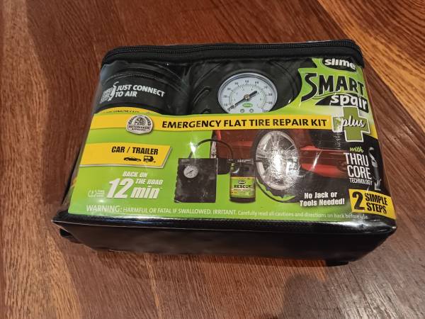 NEW IN PACKAGE Slime #50138 Flat Tire Puncture Repair, Smart Spair Plus, Emergency Kit for Car Tires, Includes Sealant and Tire Inflator Pump, Suitable for Cars and Other Highway Vehicles, 12 Min Fix. More sealant and a more powerful tire inflator for large tires found on Trucks, SUVs, Vans, and Trailers. *** Retail is $34.40 ***