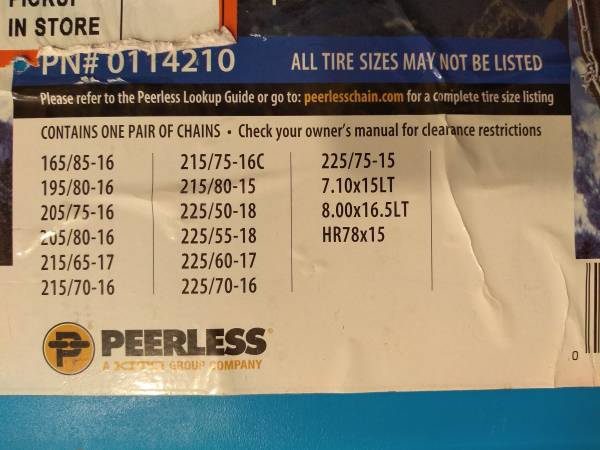 Brand new unopened cable chains, "Peerless" brand from Walmart. See photos of box for specific tire-sizes which fit. Pickup only, cash only.